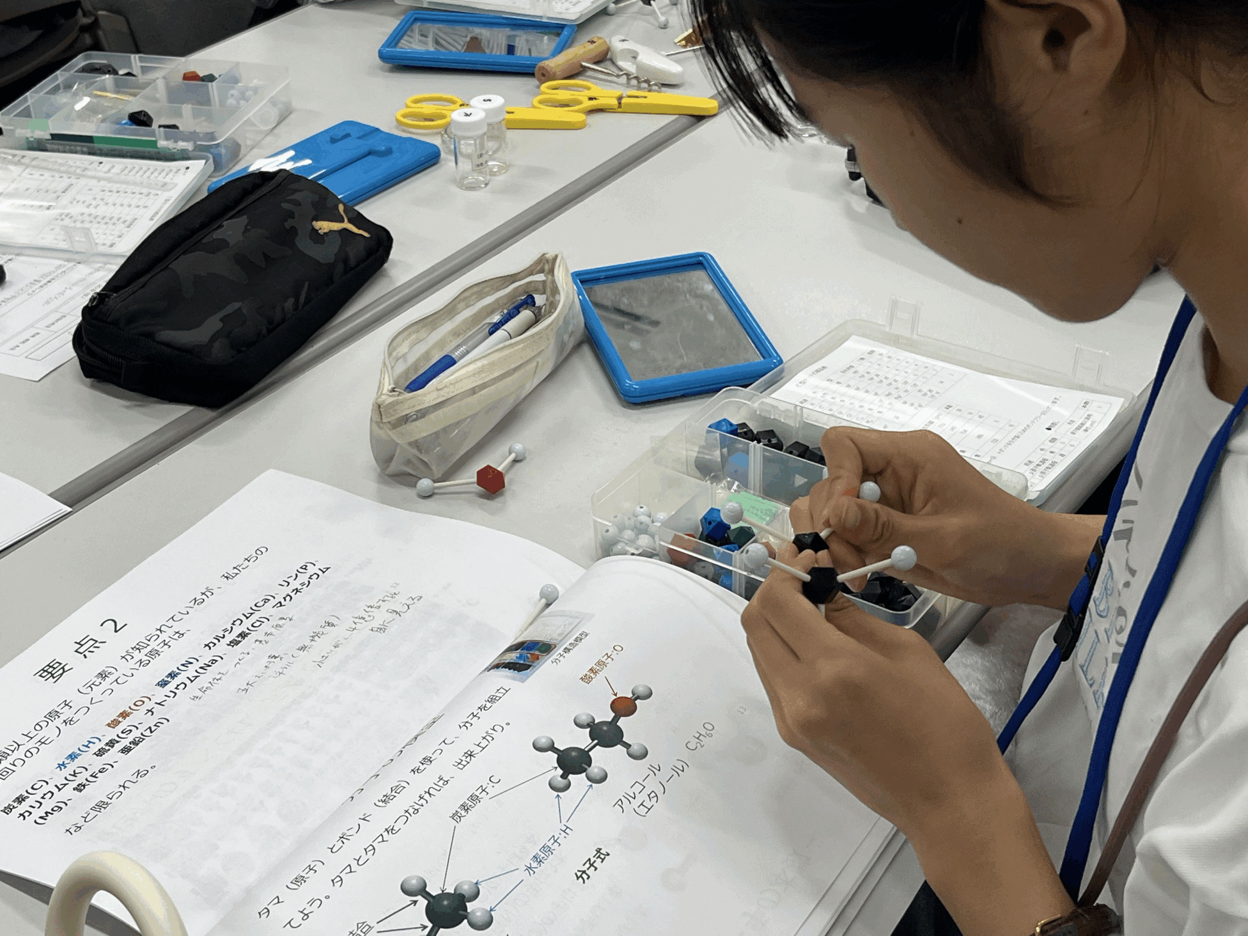 今回は、分子という目に見えない物質について学習しましたが、模型を用いることで分子の存在や原子の結びつき方で性質が変わるという面白さに触れることができました。