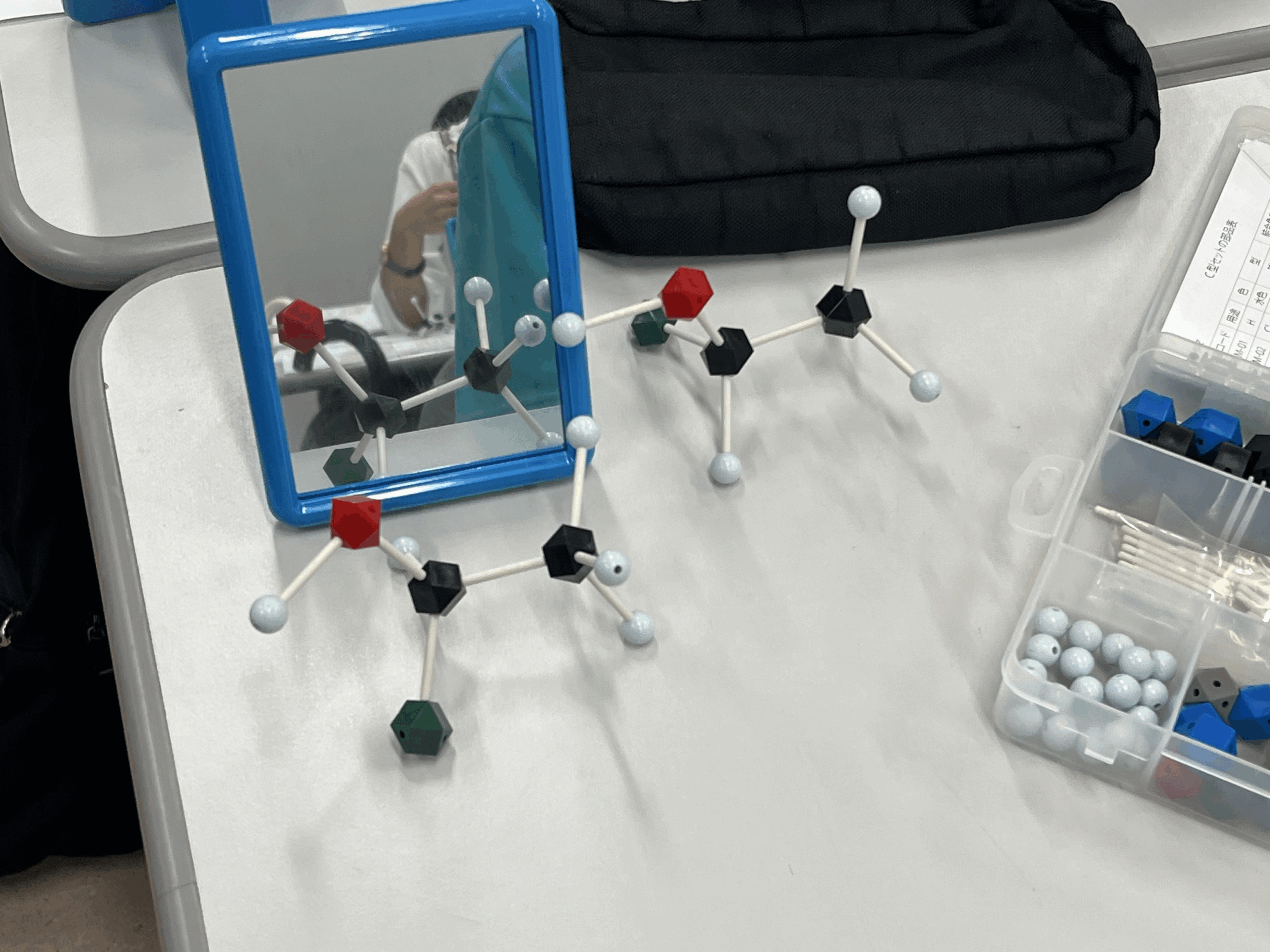 始めは課題に苦戦していた受講生ですが、何度も分子模型を組み替えることでキラルな分子をつくるための条件に気づくことが出来ました。そして、それが不斉炭素原子と呼ばれていることを学習しました。