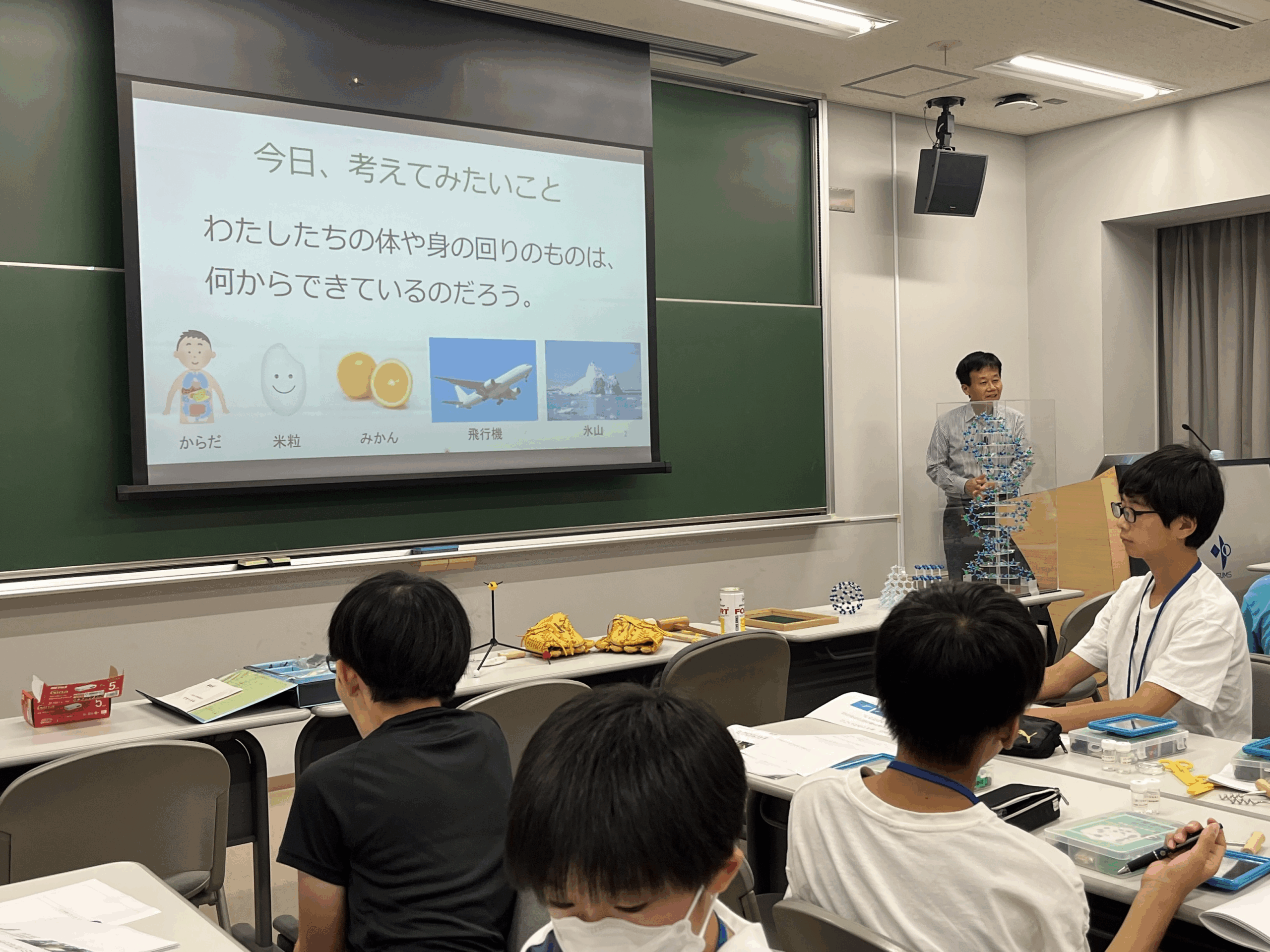 始めに、受講生たちは「私たちの体や身の回りのものは、何からできているのか。」について、これまでの生活経験や学習したことから考えました。その後、すべてのものは、目に見えないほど小さな粒である『原子』が集まってできていること、原子は目に見えないくらい小さなものであることを学びました。