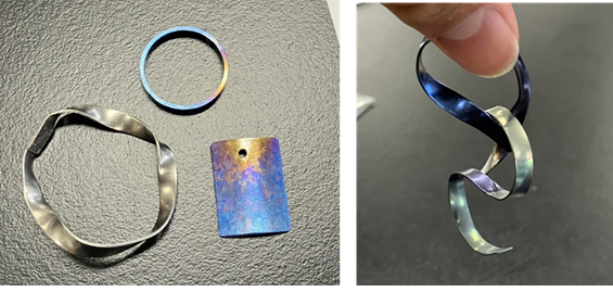 陽極酸化処理とチタンの色が変化する仕組みを学習した受講生は、チタンリング、長方形チタン板、細長チタン板を自分好みの色・形をイメージした後、加工に取り掛かりました。