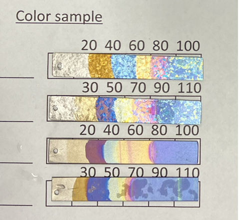 その後、陽極酸化処理を通常のチタン板と結晶粒を粗大化したチタン板を用いて、その色を変えるという実験を行いました。加える電圧の大きさや加えた時間の違いによって異なる色に変化することを体験し、その色の変化は、チタン板に付着する酸化被膜の厚さが関係していることを学びました。