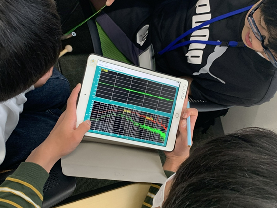 次に音の性質を理解するために周波数や固有振動数などについて学習しました。その後適当な長さのパイプを叩いて固有振動数を求める加振実験を班ごとに行いました。受講生はタブレットに映し出された波形に興味を持っていました。