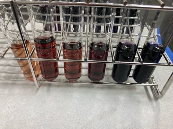 さらに、自分の唾液を綿棒に含ませ、それをデンプン溶液に加え、5分培養後、ヨウ素液に混合、吸光度を測定しました。唾液に含まれるアミラーゼによってデンプンが分解されることを確認できました。