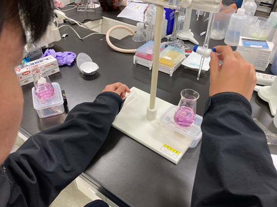 中でも滴定法の大事なポイントは、溶液を混ぜながら色が変わった瞬間(紫色から青色に変化)に滴定を止めることです。そこで、8月30日の観察実験講座「電子工作」で作製したマグネチックスターを使って、機械に溶液を混ぜてもらいながら、滴定操作を行いました。これにより、色が変化する瞬間を見逃さず、集中でき、より正確な値が導き出せました。