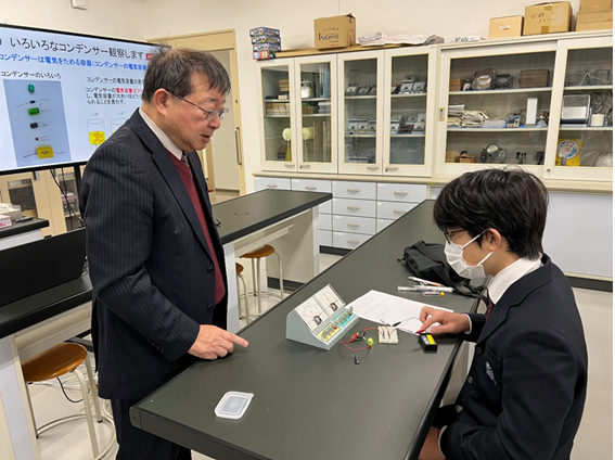 コンデンサーの役割について学習後、受講生は充電と放電を同時に行う「コンデンサーの放電回路」をつくりました。